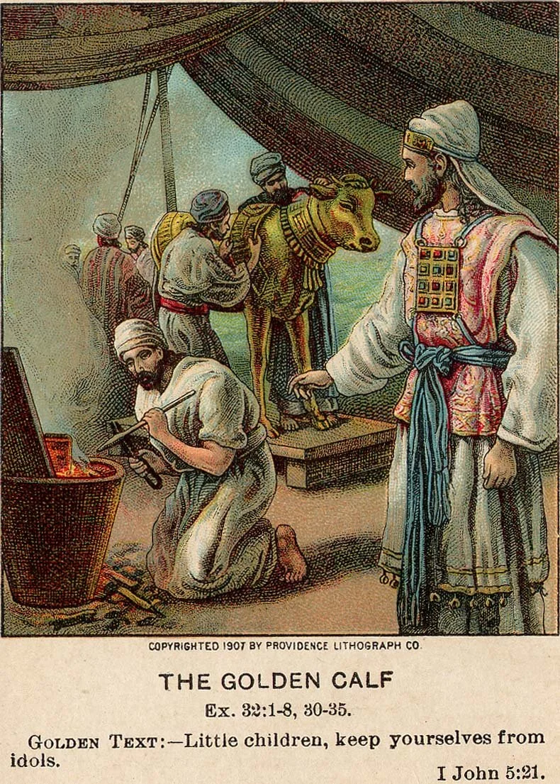 “The Golden Calf” story in the bible denounces the risks of idolatry and praising false gods represented by the sculpture of a golden calf . It’s interesting that the bible denounces the representation of a false god through art while afterward Catholicism used art for centuries to promote their own religion. The Jewish, Christian and Muslim religions are all, I believe, prohibited to represent God. Nevertheless, The Catholics church commissioned a vase amount of religious art: millions of paintings and sculptures of Jesus, the holy spirit depicted as a dove and even God, depicted on the ceiling of the Sistine chapel.